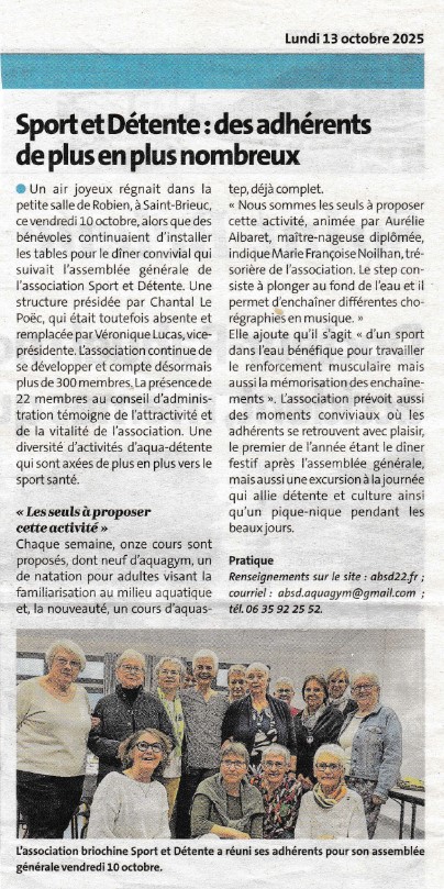- Rapport moral et financier saison 2024-2025 : 291 adhérents inscrits, pour 10 créneaux horaires répartis entre Aquaval et Hélène Boucher – de nombreux participants aux 3 festivités de la saison (AG 2024, pique-nique en mars 2025, sortie à Bréhat le 21 juin) – participation aux manifestations organisées par l’UFOLEP – un budget présentant un solde positif.